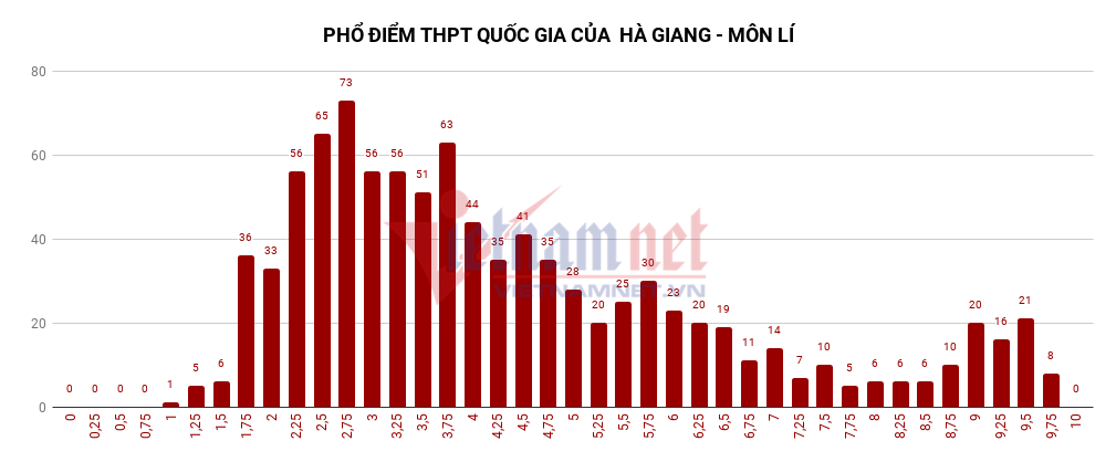 Theo phổ điểm môn Vật lý của địa phương này, có đến 65 thí sinh đạt mức điểm từ 9 trở lên, trong khi chỉ có 28 thí sinh đạt mức điểm 8 từ đến dưới 9.