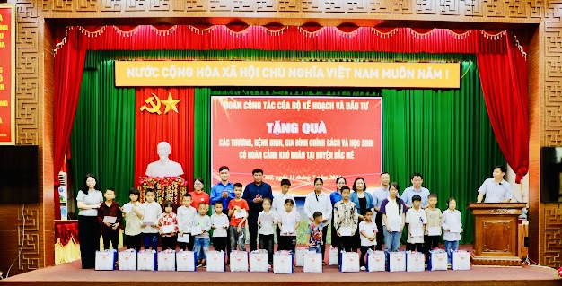 Cũng trong ngày 11/7, tại Hội trường Trung tâm huyện Bắc Mê, Thứ trưởng Nguyễn Thị Bích Ngọc và Đoàn công tác của Bộ Kế hoạch và Đầu tư đã tặng quà cho 45 thương, bệnh binh của huyện Bắc Mê. Đoàn cũng tặng quà cho 20 cháu có hoàn cảnh đặc biệt khó khăn trên địa bàn huyện Bắc Mê.