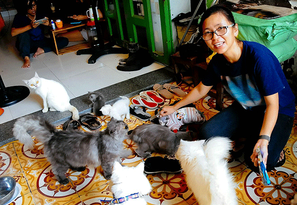 Chị Trâm bên những chú mèo đáng yêu. Ảnh: DUY TÂN