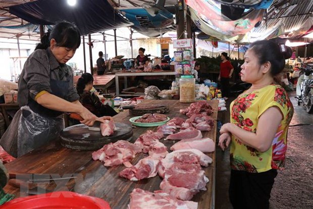 Thịt lợn tăng giá, người dân dè dặt hơn khi mua thịt lợn tại chợ Nhớn, thành phố Bắc Ninh. (Ảnh: Thanh Thương/TTXVN)