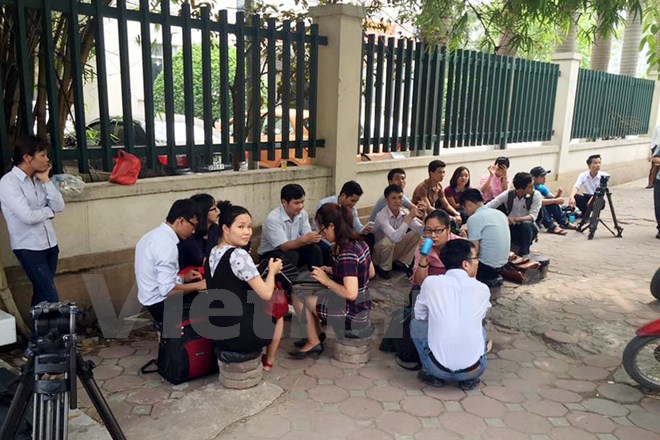 Phóng viên báo chí bị 'chặn" ngoài cổng Bộ Tài nguyên và Môi trường. (Ảnh: PV/Vietnam+)