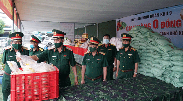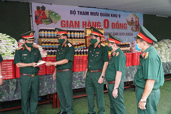 “Gian hàng 0 đồng” của Bộ Tham mưu QK9 diễn ra từ ngày 28 đến 30-7 nhằm hỗ trợ người dân bị ảnh hưởng bởi dịch COVID-19. Đơn vị tổ chức trao 500 phần quà cho người dân ở các phường An Thới, Bùi Hữu Nghĩa (quận Bình Thủy). Các phần quà gồm thịt heo, thịt gà, gạo, dầu ăn… với tổng giá trị 250 triệu đồng, do Bộ Tham mưu trích từ quỹ của đơn vị và vận động từ các doanh nghiệp, tổ chức, cá nhân.