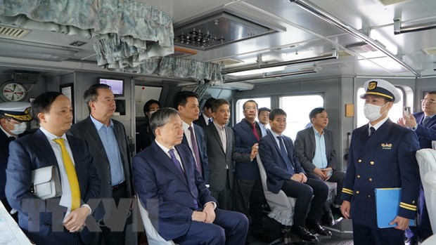 Bộ trưởng Tô Lâm và đoàn đại biểu cấp cao của Bộ Công an Việt Nam thăm Lực lượng Bảo vệ Bờ biển Nhật Bản. (Ảnh: TTXVN phát)