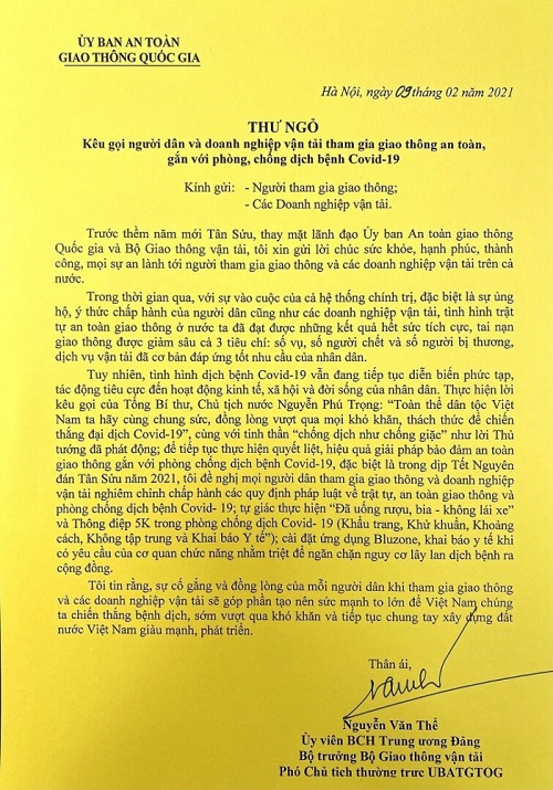 | Toàn văn bức thư gửi đến người dân, doanh nghiệp của Bộ trưởng Bộ GTVT, Phó Chủ tịch thường trực Ủy ban ATGT Quốc gia Nguyễn Văn Thể |