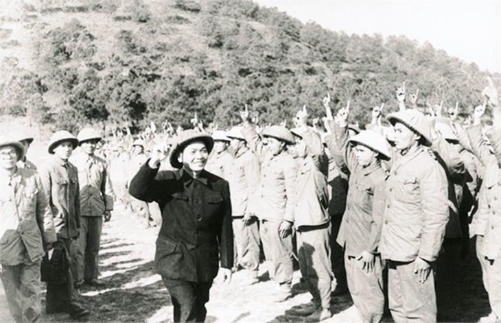 | 17h30 phút ngày 13/3/1954, Đại tướng, Tổng Tư lệnh Võ Nguyên Giáp ra lệnh nổ súng tấn công Tập đoàn cứ điểm Điện Biên Phủ. Ảnh: Tư liệu TTXVN. |