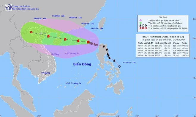 Bản đồ đường đi của bão số 3 lúc 13h ngày 04/9/2024. (Ảnh: TTXVN phát)