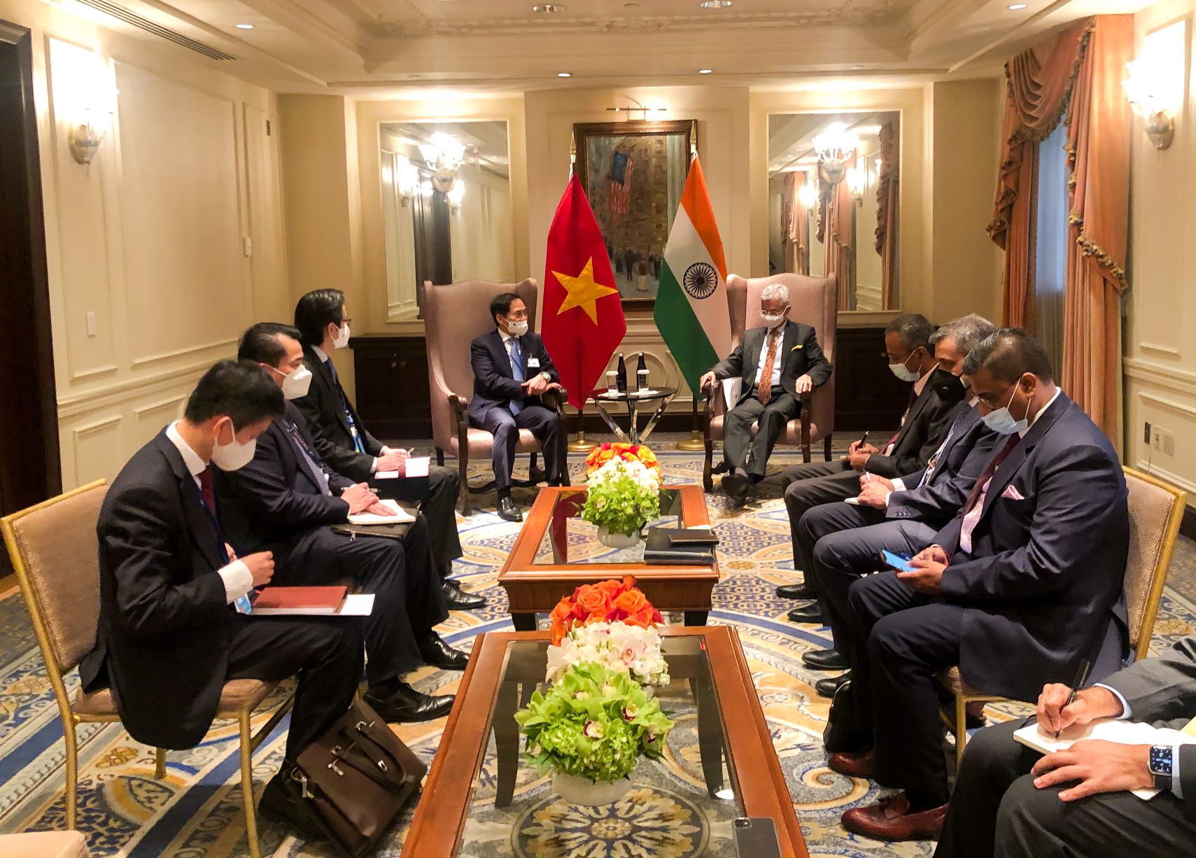 Tại cuộc gặp với Bộ trưởng Ngoại giao Ấn Độ Subramanyam Jaishankar, Bộ trưởng Bùi Thanh Sơn đánh giá cao sự hỗ trợ kịp thời, hiệu quả về trang thiết bị y tế, thuốc điều trị COVID-19; đề nghị hai nước phối hợp chặt chẽ tổ chức kỷ niệm 50 năm quan hệ Việt Nam- Ấn Độ; đề nghị Ấn Độ tạo thuận lợi cho hàng hóa Việt Nam tiếp cận thị trường Ấn Độ. Bộ trưởng Ngoại giao Ấn Độ khẳng định tiếp tục hợp tác, hỗ trợ Việt Nam về vắc-xin, thuốc điều trị COVID-19 và vật phẩm y tế; mong muốn thúc đẩy hợp tác thương mại, đầu tư, năng lượng; chia sẻ một số vấn đề quốc tế hai nước cùng quan tâm, v.v…