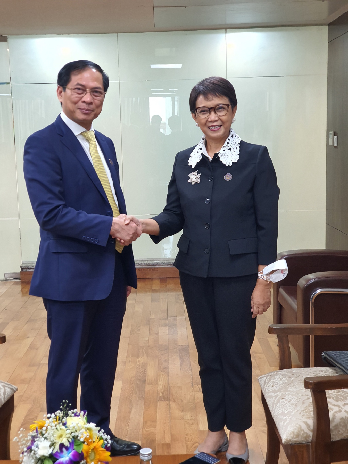 Tại cuộc gặp với Bộ trưởng Ngoại giao Indonesia Retno Marsudi, hai bên trao đổi về các biện pháp thúc đẩy quan hệ hai nước trong giai đoạn hậu đại dịch và nhất trí phối hợp chuẩn bị tốt cho các chuyến thăm cấp cao và Kỳ họp lần thứ IV Ủy ban hợp tác song phương Việt Nam – Indonesia trong năm 2022. Hai bên nhất trí thúc đẩy các cơ quan bộ, ngành hai nước phối hợp chặt chẽ, đặc biệt là trong lĩnh vực kinh tế - thương mại, nhằm mang lại những kết quả cụ thể cho người dân và doanh nghiệp hai nước. Hai bên cũng nhất trí tiếp cận và giải quyết các vấn đề khu vực và quốc tế trên cơ sở tôn trọng luật pháp quốc tế vì mục tiêu chung là hoà bình, ổn định, hợp tác và phát triển.