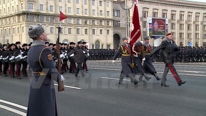 Diễu binh kỷ niệm 100 năm Ngày thành lập lực lượng cảnh sát Belarus. (Ảnh: Quang Vinh/Vietnam+)