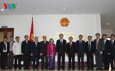 Đại sứ quán Việt Nam tại Lào. Thay mặt cán bộ, nhân viên Đại sứ quán, Đại sứ Nguyễn Mạnh Hùng đã báo cáo với Bộ trưởng Trần Đại Quang về tình hình, kết quả công tác của Đại sứ quán thời gian qua.