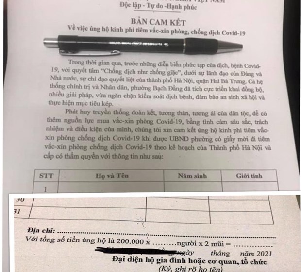 Một cam kết ủng hộ kinh phí tiêm vaccine do người dân cung cấp.