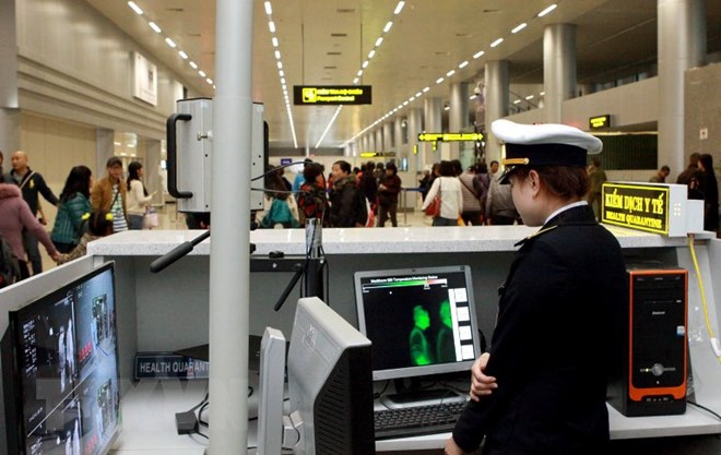 Nhân viên Trung tâm Kiểm dịch Y tế quốc tế kiểm tra thân nhiệt và kê tờ khai y tế cho hành khách. (Ảnh: Dương Ngọc/TTXVN)