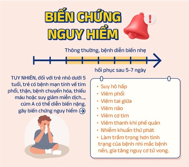Tiến sĩ, bác sĩ Nguyễn Văn Lâm, Giám đốc Trung tâm Bệnh nhiệt đới (Bệnh viện Nhi T.Ư), lưu ý với trẻ dưới 5 tuổi, trẻ có bệnh mạn tính về tim phổi, bệnh chuyển hóa, thiếu máu hoặc suy giảm miễn dịch, cúm A dễ gây các biến chứng nguy hiểm như: suy hô hấp, viêm phổi, viêm tai giữa, viêm não, viêm cơ tim, làm trầm trọng hơn tình trạng bệnh nền đang mắc phải, gia tăng nguy cơ tử vong.