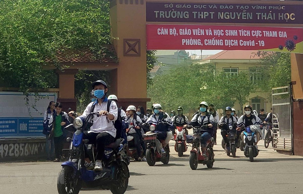 Học sinh Trường THPT Nguyễn Thái Học, thành phố Vĩnh Yên đi học trở lại sau kì nghỉ dài. (Ảnh: Hoàng Hùng/TTXVN)