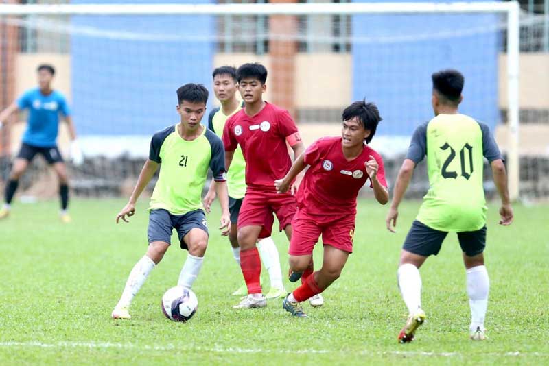 Cầu thủ Cần Thơ (trái) thi đấu tập huấn trước khi tham dự giải hạng Ba 2023.