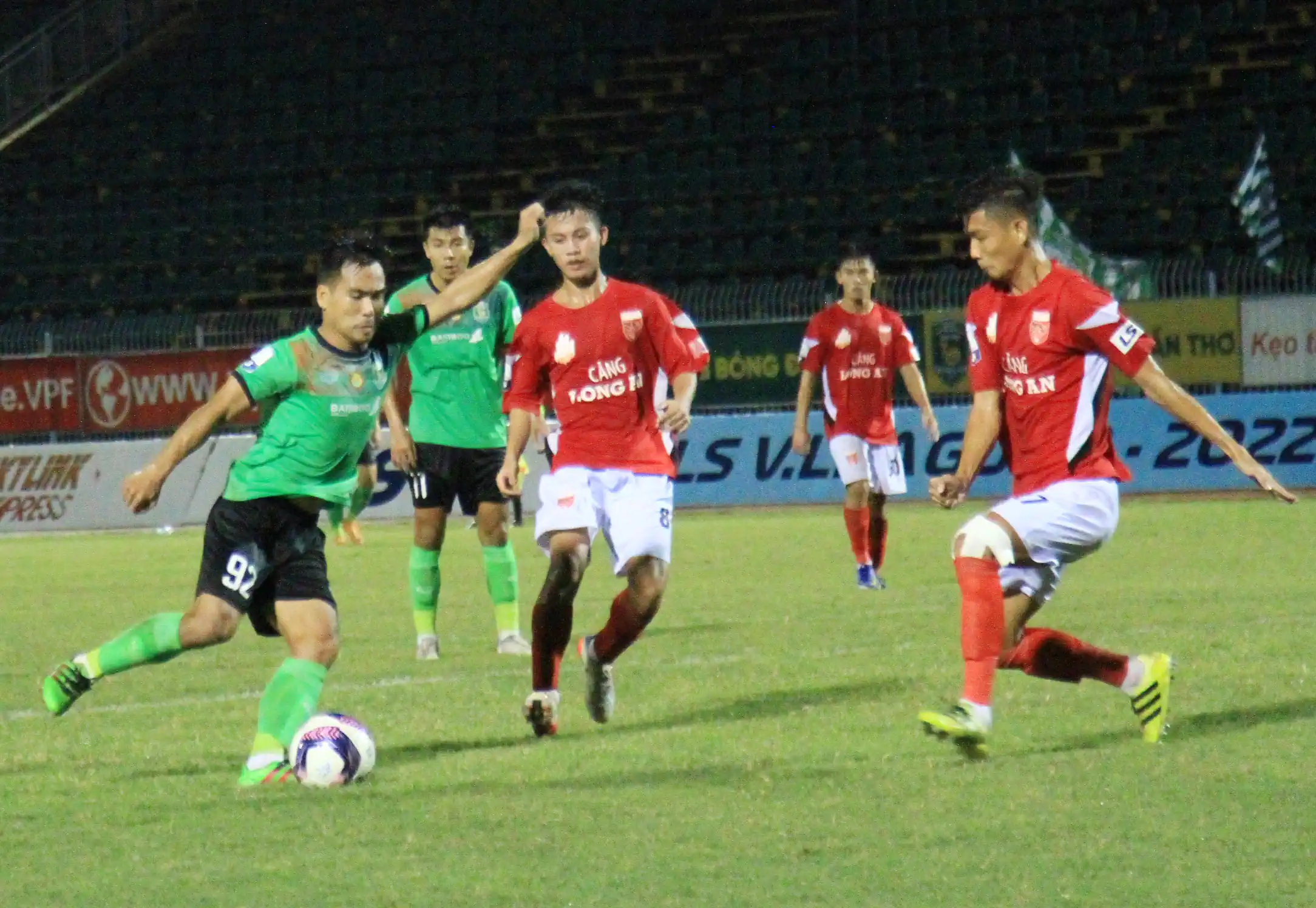 Đội Cần Thơ (trái) gặp Long An mùa giải hạng Nhất năm 2022, trước khi đội Cần Thơ giải thể. Nay, đội Long An cũng đang gặp nhiều khó khăn để tiếp tục trụ lại giải. Ảnh: NGUYỄN MINH