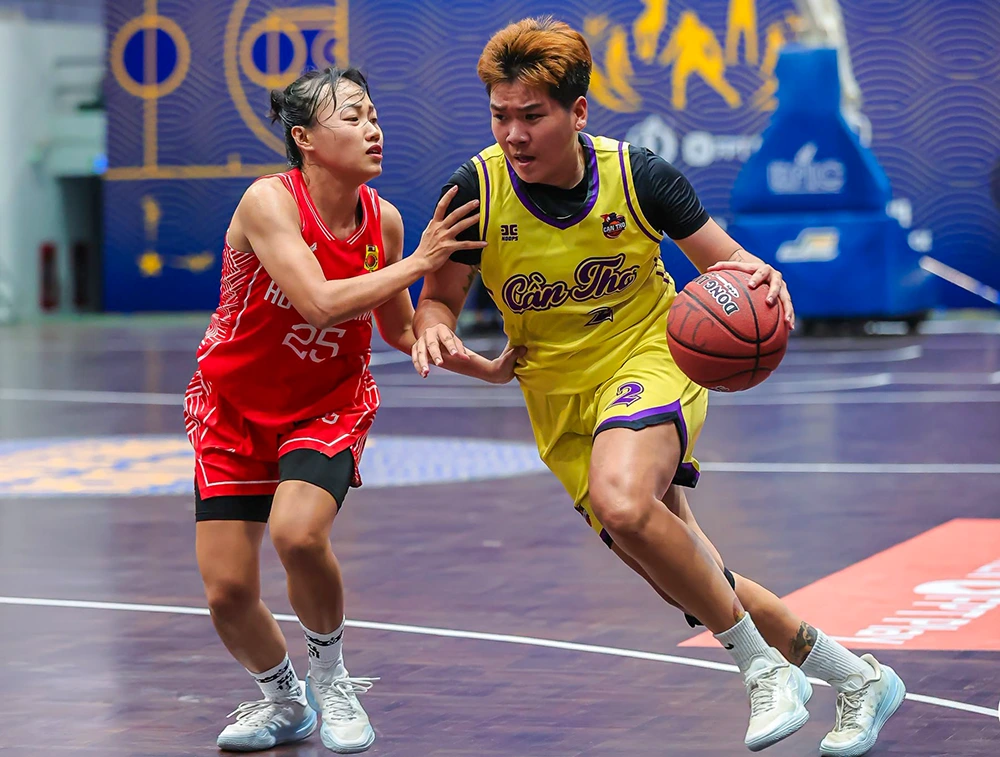 VĐV đội Bóng rổ nữ Cần Thơ (phải) trong trận chung kết tại Giải vô địch Bóng rổ 5x5 các đội mạnh quốc gia 2026. Ảnh: NVCC