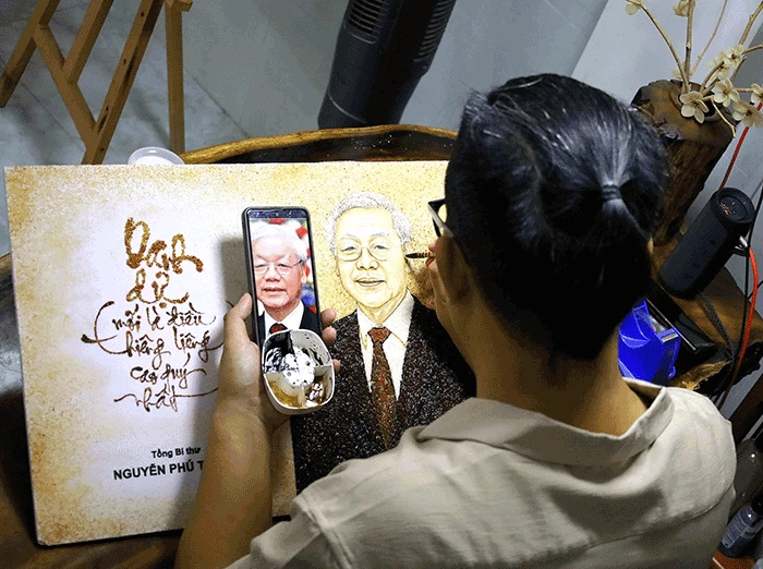 Từ Cần Thơ, quê hương “gạo trắng nước trọng”, để tưởng nhớ và gửi gắm tình cảm đối với Tổng Bí Thư Nguyễn Phú Trọng, nghệ nhân tranh gạo Trần Đăng Nghiêm (quận Ninh Kiều) đã làm nên bức tranh khắc họa chân dung Tổng Bí thư Nguyễn Phú Trọng bằng gạo.