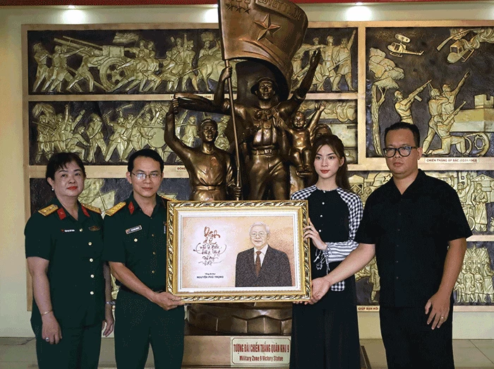 Tham gia hỗ trợ làm bức tranh này có đương kim Hoa khôi Học sinh, sinh viên thanh lịch TP Cần Thơ - Phan Lê Kim Ngọc, sinh viên Trường Đại học FPT Cần Thơ. Hoa khôi Phan Lê Kim Ngọc cho biết: “Tôi rất vui khi được góp sức cùng nhóm anh Nghiêm làm bức tranh chân dung Tổng Bí thư, để thể hiện lòng biết ơn, sự tưởng nhớ về Bác. Tôi cũng nguyện phấn đấu học tập, lao động, cống hiến tuổi trẻ để góp phần xây dựng quê hương, đất nước như lúc sinh thời, Tổng Bí thư Nguyễn Phú Trọng đã nhắn nhủ tuổi trẻ”.