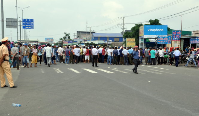 Ùn ứ giao thông do người dân đổ cá ra đường và ngồi trên quốc lộ 51 - Ảnh: ĐÔNG HÀ