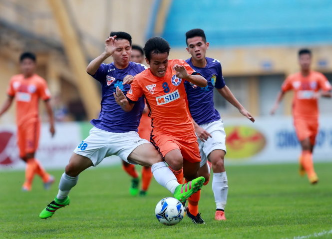 Một pha bóng trong trận Hà Nội T&T (trái) gặp SHB Đà Nẵng ở vòng 8 V-League 2016 hôm 1-5. Ảnh: Nam Khánh