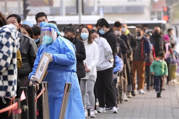 Người dân xếp hàng chờ xét nghiệm COVID-19 tại Bắc Kinh (Trung Quốc), ngày 10/11/2022. (Ảnh: Kyodo/TTXVN)