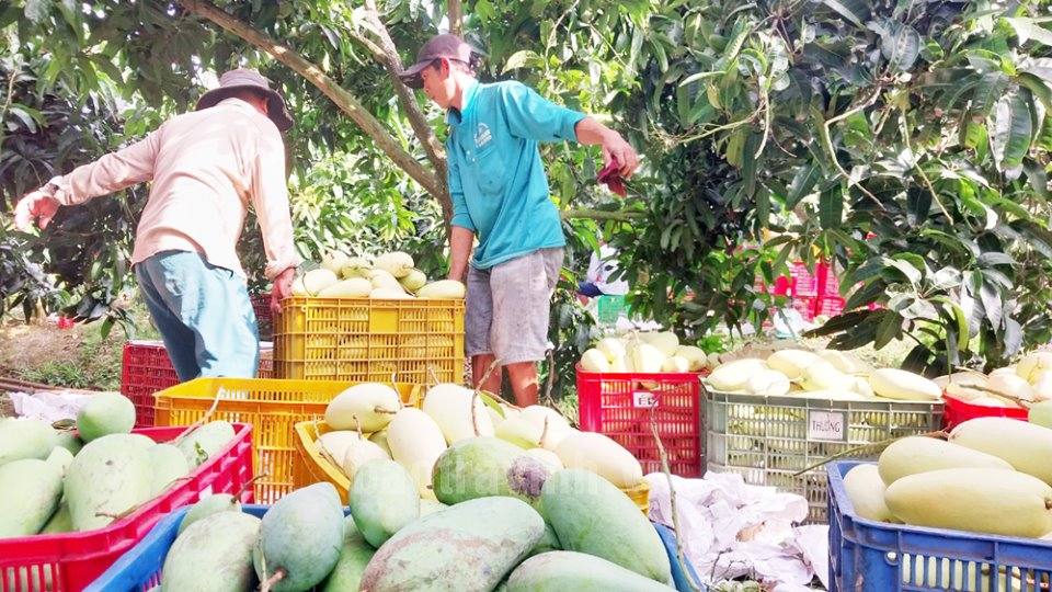 Nhà vườn xã Hòa Tân thu hoạch vụ xoài đầu năm 2024.