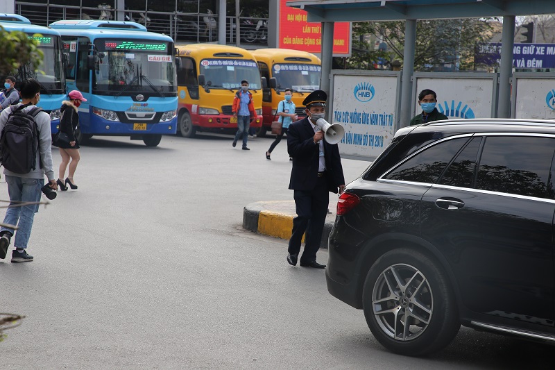 | Bảo vệ dùng loa nhắc nhở xe và hành khách tại bến xe Giáp Bát Hà Nội. |