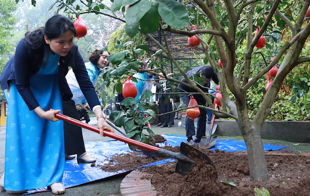 | Chủ tịch Hội LHPN Việt Nam Hà Thị Nga trồng cây bưởi đỏ giống Đông Cao tại Khu Di tích Phủ Chủ tịch |