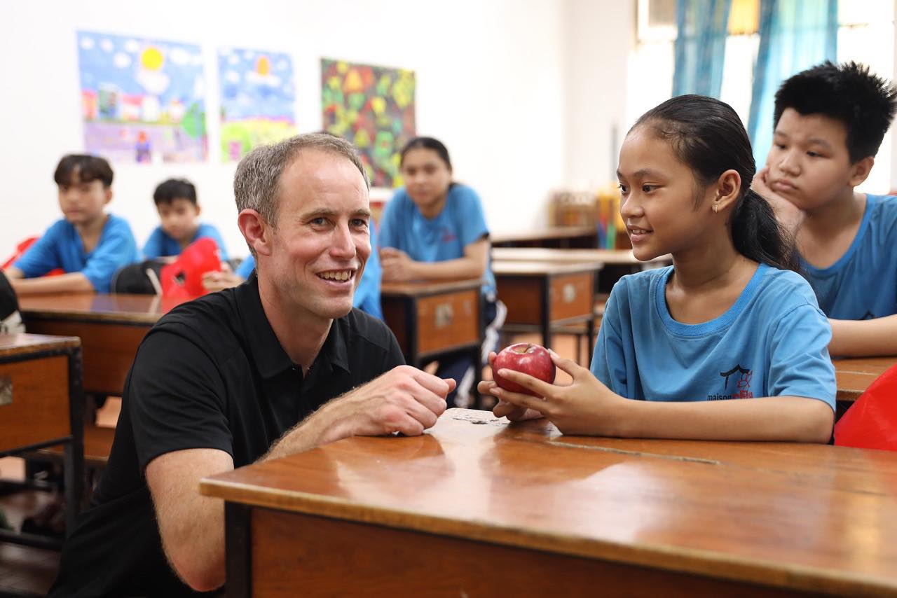 | Tổng Lãnh sự New Zealand Scott James tặng quà cho các em nhỏ. (Ảnh: Đại sứ quán New Zealand tại Việt Nam) |