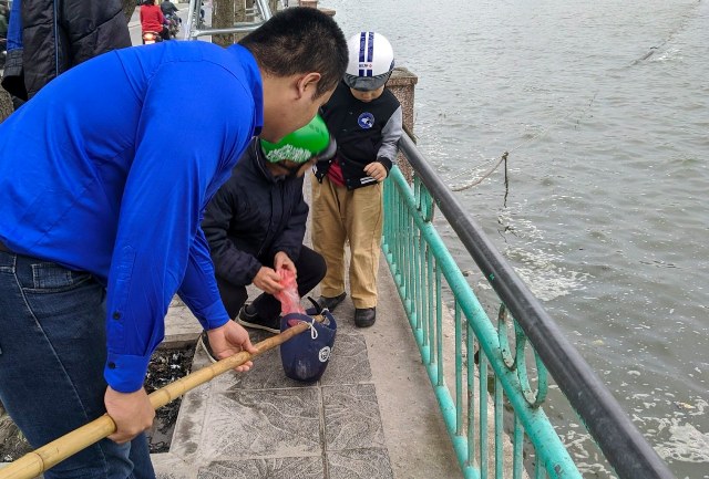 | Thanh niên tình nguyện quận Tây Hồ giúp người dân thả cá ở Hồ Tây ngày 23 tháng Chạp. |