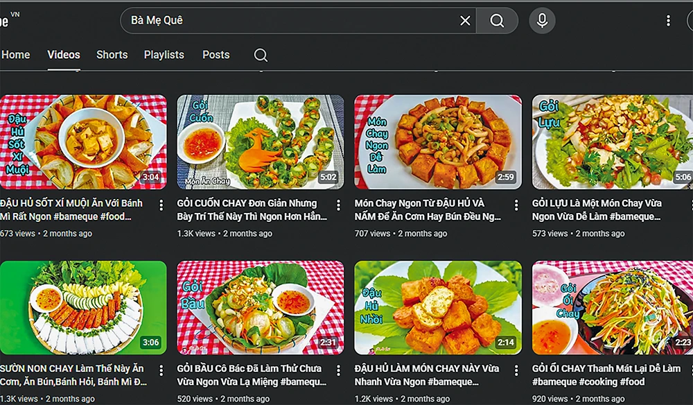 Các video về ẩm thực chay trên kênh YouTube Bà Mẹ Quê. Ảnh: chụp màn hình