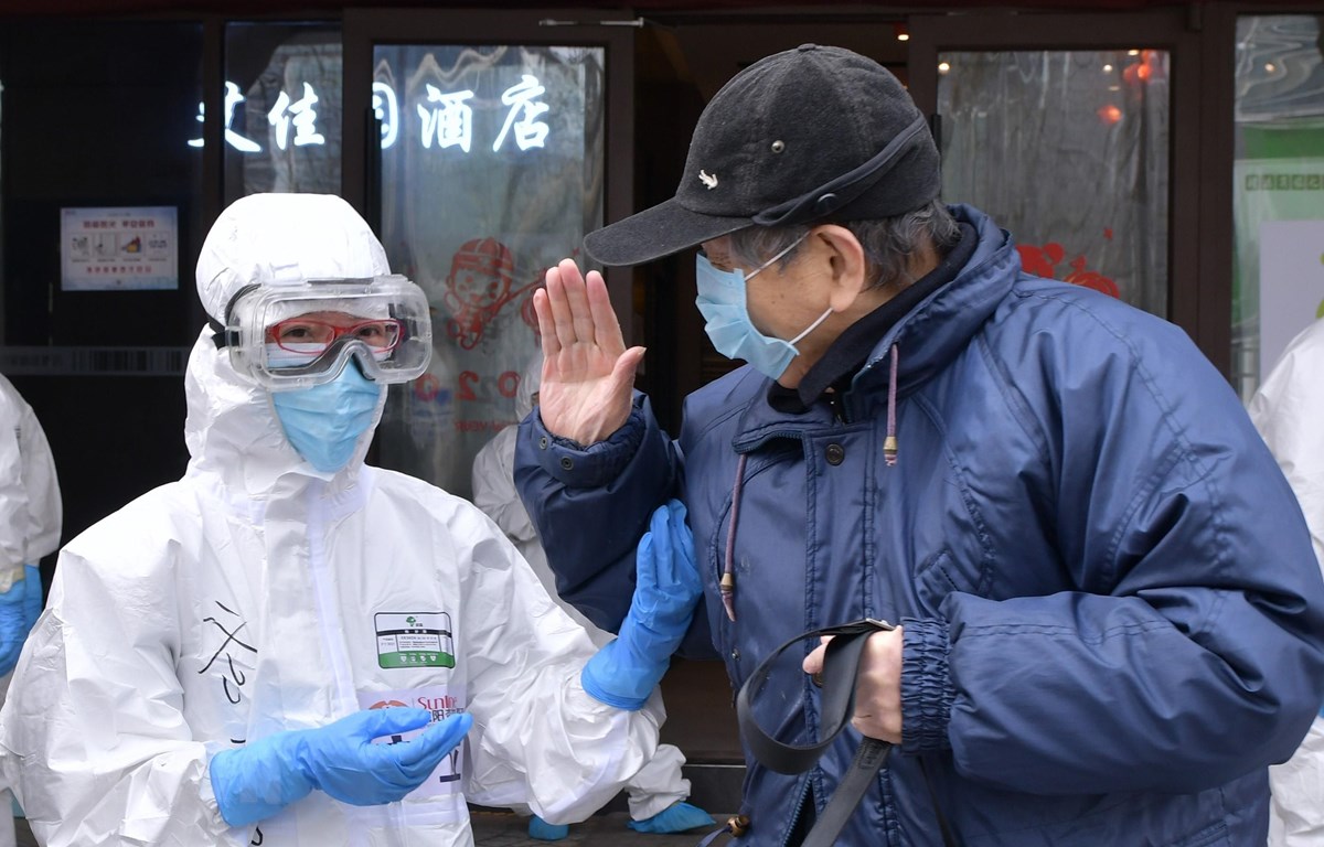 Bệnh nhân nhiễm COVID-19 tạm biệt bác sĩ sau khi được chữa khỏi tại bệnh viện ở Vũ Hán, tỉnh Hồ Bắc, Trung Quốc, ngày 10/3/2020. (Ảnh: THX/TTXVN)