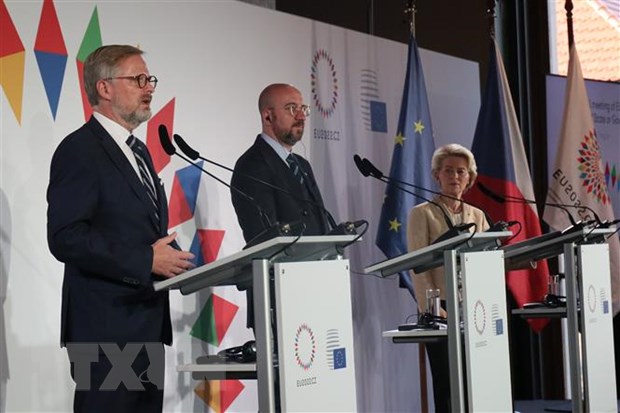 Thủ tướng Séc Petr Fiala (trái) cùng các nhà lãnh đạo EU tại cuộc họp báo sau khi kết thúc Hội nghị thượng đỉnh không chính thức của EU tại Prague, ngày 7/10. (Ảnh: Ngọc Biên/TTXVN)