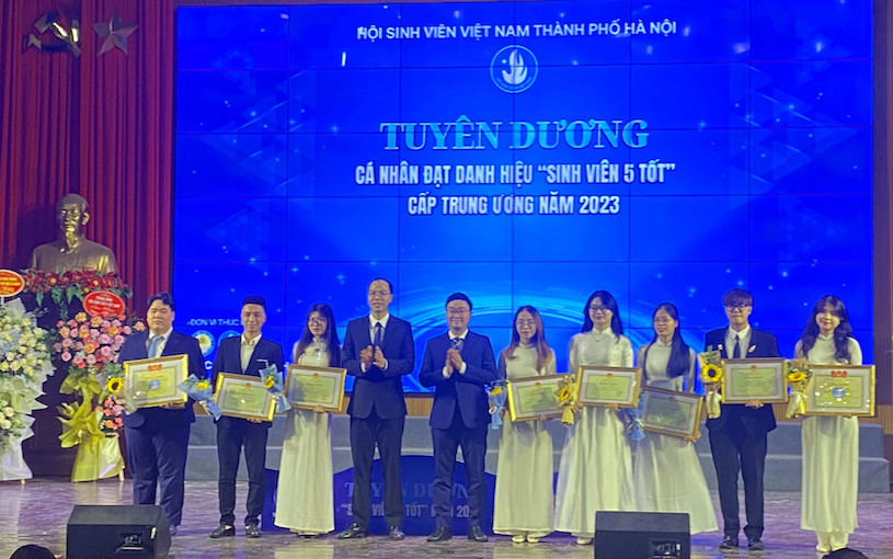 | Phó Chủ tịch Trung ương Hội Sinh viên Việt Nam Nguyễn Bá Cát và Chủ tịch Hội Sinh viên thành phố Hà Nội Nguyễn Tiến Hưng trao giải thưởng "Sinh viên 5 tốt" cho các sinh viên |