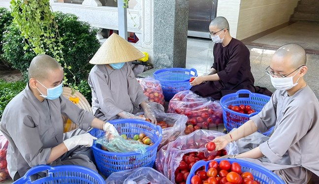 | Tăng ni, phật tử tham gia tiếp nhận, phân loại nhu yếu phẩm để hỗ trợ người dân có hoàn cảnh khó khăn tại các điểm cách ly, phong tỏa do ảnh hưởng dịch COVID -19 trên địa bàn huyện Bình Chánh, Thành phố Hồ Chí Minh. (Ảnh: Thy Thơ) |