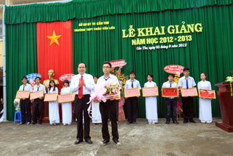 | Đồng chí Trần Thanh Mẫn, Ủy viên Trung ương Đảng, Bí thư Thành ủy Cần Thơ, trao hoa và quà khen thưởng cho học sinh của Trường THPT Châu Văn Liêm đậu thủ khoa các ngành bậc đại học. Ảnh: KIM XUÂN |