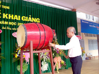 | Đồng chí Nguyễn Thanh Sơn, Chủ tịch UBND TP Cần Thơ đánh trống khai trường tại Trường THPT chuyên Lý Tự Trọng. Ảnh: LAN PHƯƠNG |