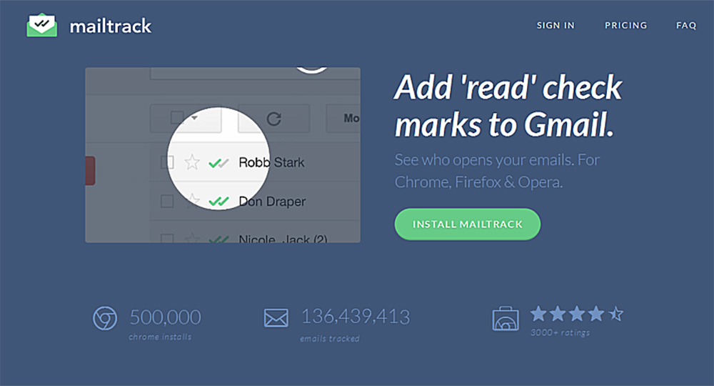 Mailtrack.io là tiện ích đơn giản và miễn phí mà hiện đang được sử dụng rộng rãi, tuy nhiên nó sẽ nhúng chữ ký vào mỗi email bạn soạn, trừ khi bạn trả phí. Ứng dụng này sẽ được thông báo bằng nhiều cách khi ai đó đọc email, bao gồm thông báo bật lên, thông báo qua email và các dấu kiểm trong thư mục được gởi trong Gmail.