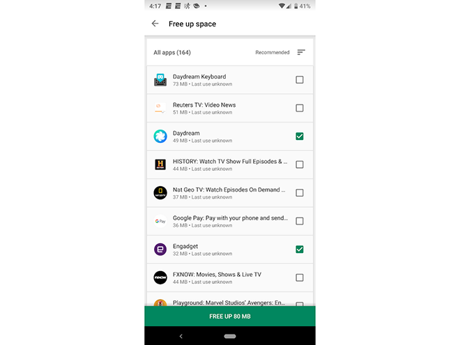 Nhấn vào thông báo sẽ đưa người dùng đến Play Store, nơi một lần nhấn khác sẽ hiển thị danh sách các ứng dụng chưa được sử dụng gần đây. Mỗi danh sách hiển thị cho người dùng lần cuối cùng họ sử dụng một ứng dụng cụ thể, và họ có thể giải phóng được bao nhiêu dung lượng nếu xóa nó.