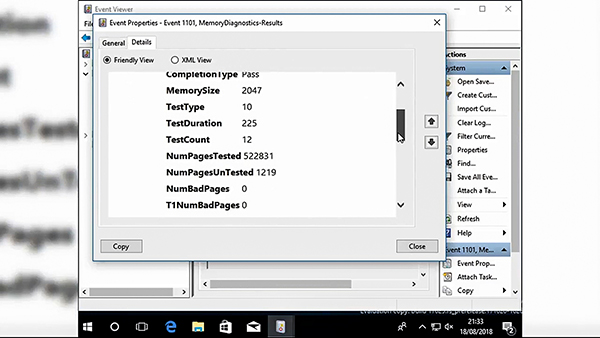 Sau khi kiểm tra xong, bạn xem kết quả bằng cách nhấn tổ hợp phím Windows+X, chọn Event Viewer, rồi chọn Event Viewer (Local)/ Windows Logs/ System. Trong cột bên phải, bạn hãy chọn Find, nhập “MemoryDiagnostic”, rồi nhấp Find Next. Kết quả chẩn đoán sẽ hiển thị ở phần dưới cửa sổ, và từ đó bạn có thể “điều tra” từng lỗi cụ thể.