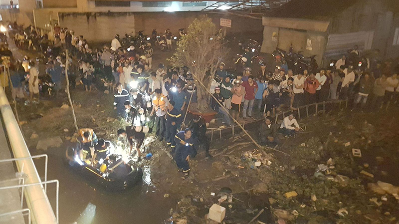 Lực lượng cứu hộ cứu nạn tổ chức tìm kiếm thi thể nạn nhân vào đêm 26-12. Rất đông người dân hiếu kỳ theo dõi vụ việc. Ảnh: KIỀU CHINH