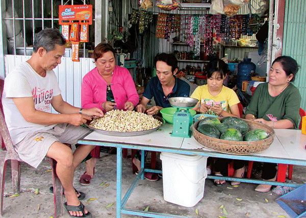 Thời gian gần đây, chị Sương còn nhận hạt điều về gia công, cạo vỏ lụa, với tiền công (5.000 đồng/kg). Trung bình mỗi ngày gia đình chị gia công được khoảng 20kg, kiếm được 100.000 đồng. Chồng chị trước đây làm nghề chạy xe Honda khách nhưng dạo gần đây sức khỏe yếu hơn trước nên cùng với chị vừa bán hàng vừa gia công hạt điều. Các con của chị Sương cũng tranh thủ thời gian rảnh phụ tiếp cha mẹ.