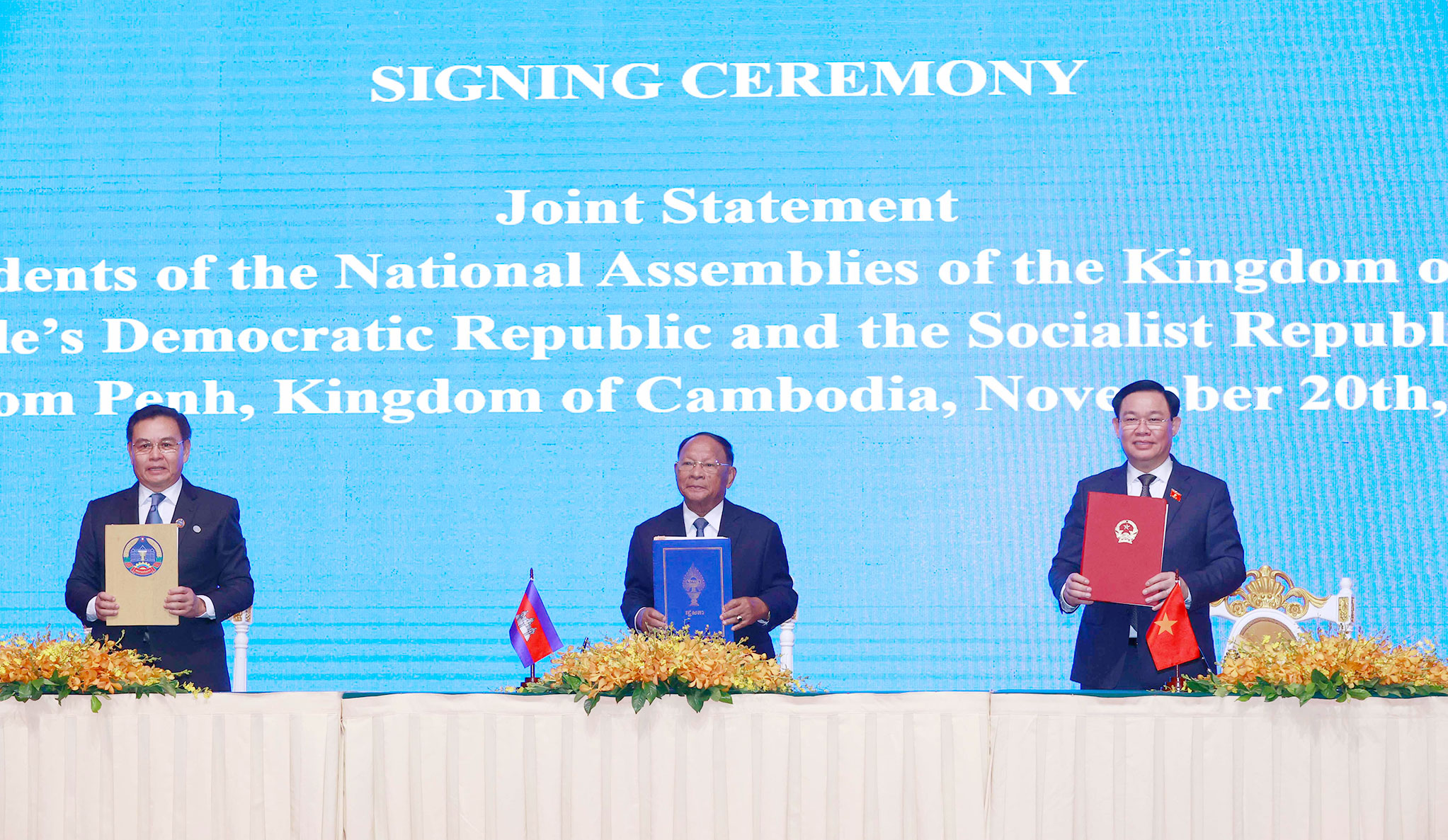 | Chủ tịch Quốc hội Vương Đình Huệ, Chủ tịch Quốc hội Campuchia Samdech Heng Samrin và Chủ tịch Quốc hội Lào Saysomphone Phomvihane ký Tuyên bố chung. Ảnh: Doãn Tấn |