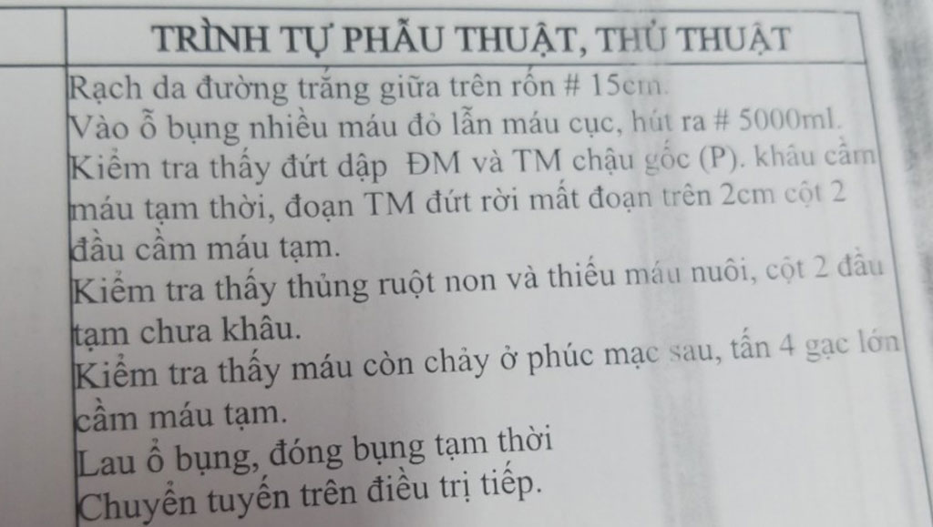 Ngay khi tiếp nhận, bệnh nhân được hồi sức tích cực, phẫu thuật cấp cứu, bệnh nhân được truyền máu khối lượng lớn (16 đơn vị hồng cầu lắng, 8 đơn vị huyết tương tươi đông lạnh và 4 đơn vị kết tủa lạnh). Các bác sĩ cũng tiến hành khâu cầm máu tạm thời, tấn gạc cầm máu cho bệnh nhân.