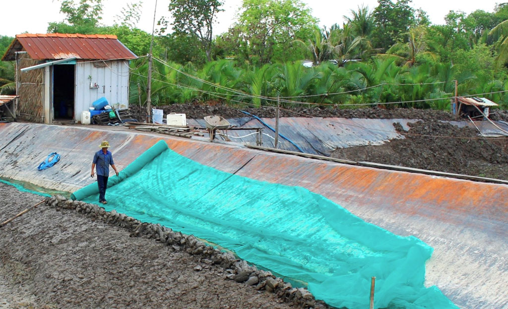 Ông Trần Hữu Nghĩa (xã Tân Ân, huyện Cần Đước) chủ động gia cố bờ bao ao tôm ngay từ đầu vụ