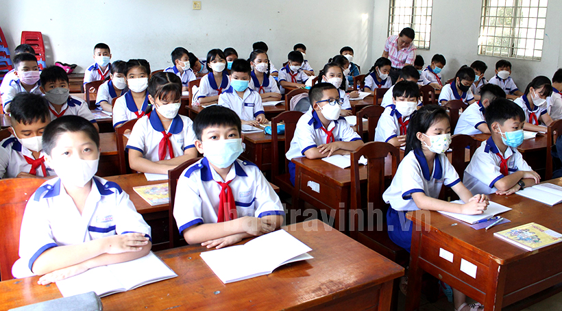 Học sinh Trường Tiểu học Lê Văn Tám, thành phố Trà Vinh trong ngày tựu trường, năm học 2022 - 2023.