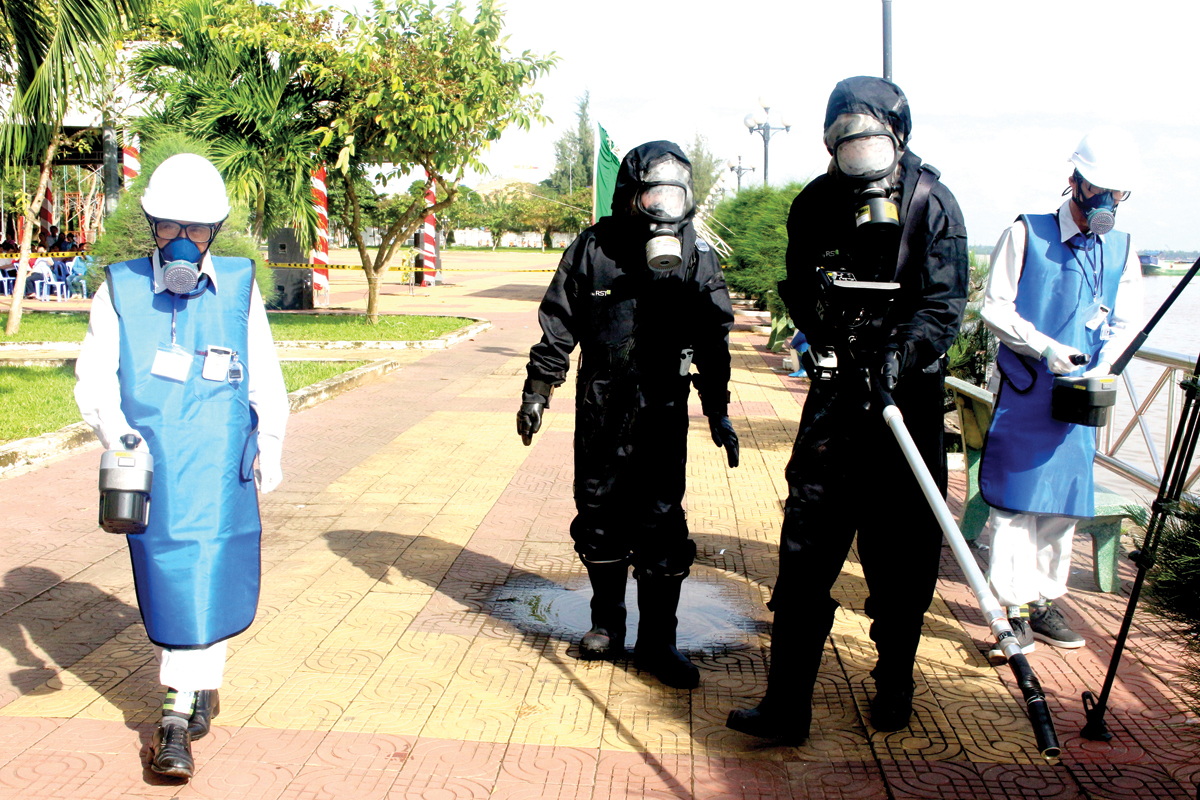 Lực lượng chức năng TP Cần Thơ rà soát, kiểm tra và xử lý vật thể phát ra bức xạ, gây ảnh hưởng sinh hoạt, môi trường, đời sống của người dân tại quận Ninh Kiều theo tình huống diễn tập giả định. Ảnh: V. THỨC