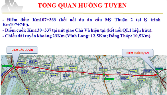 | Dự án cao tốc Mỹ Thuận - Cần Thơ dài 23km, đi qua địa phận 5 huyện, thị, thành phố của hai tỉnh Vĩnh Long và Đồng Tháp. Giai đoạn 1 của dự án quy mô 4 làn xe, bề rộng nền đường 17m, bề rộng cầu 17,5m, vận tốc 80km/giờ. Tổng mức đầu tư hơn 4.800 tỷ đồng. Thời gian thi công dự kiến 24 tháng, cơ bản hoàn thành năm 2022 và đưa vào sử dụng năm 2023. |