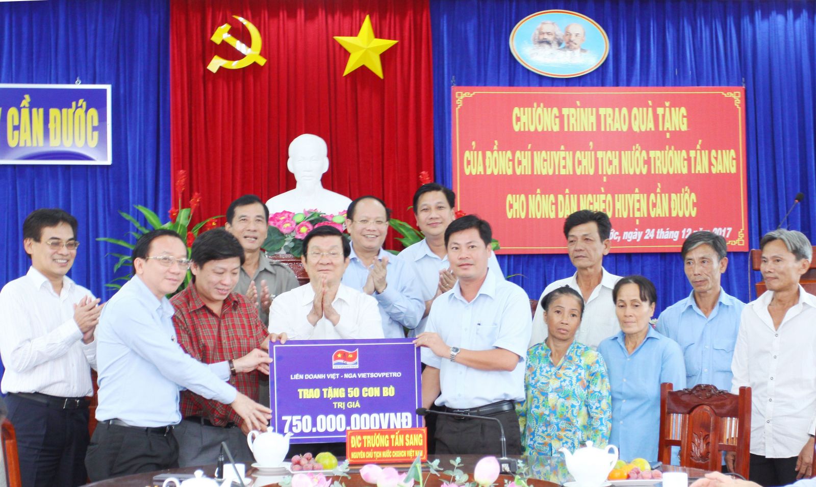 Nguyên Chủ tịch nước - Trương Tấn Sang cùng nhà tài trợ, lãnh đạo tỉnh, huyện trao biểu trưng kinh phí bò giống cho các hộ nghèo